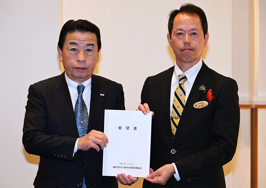 【要望書】 (一社)栃木県建設業協会 谷黒 克守 会長・栃木県県土整備部 小野 和憲 部長 (※写真左より) |