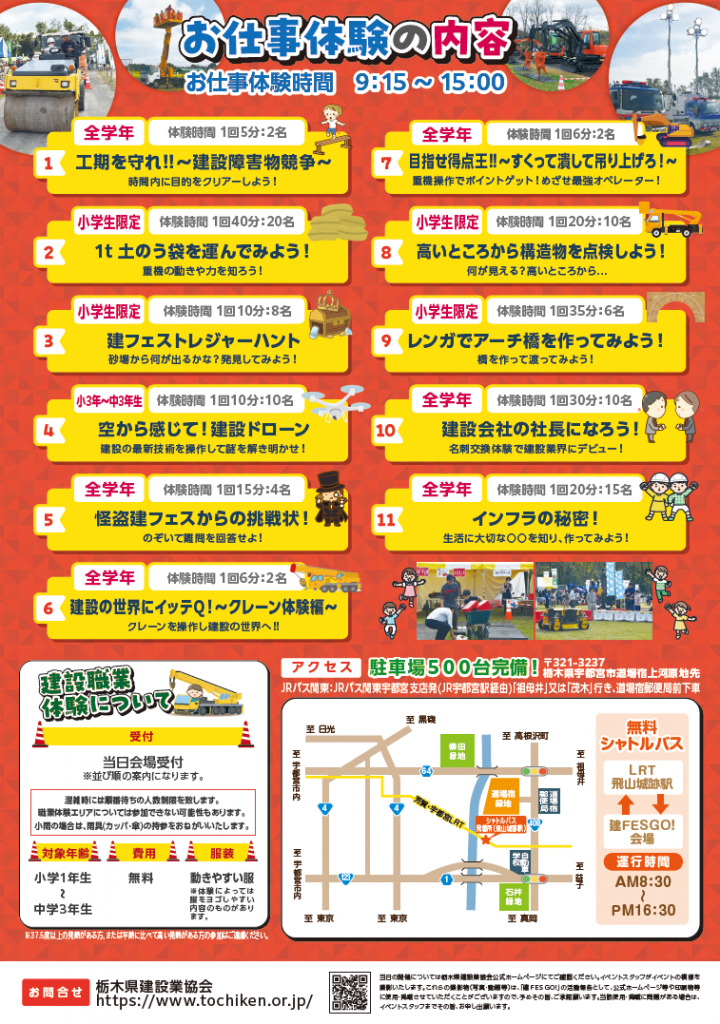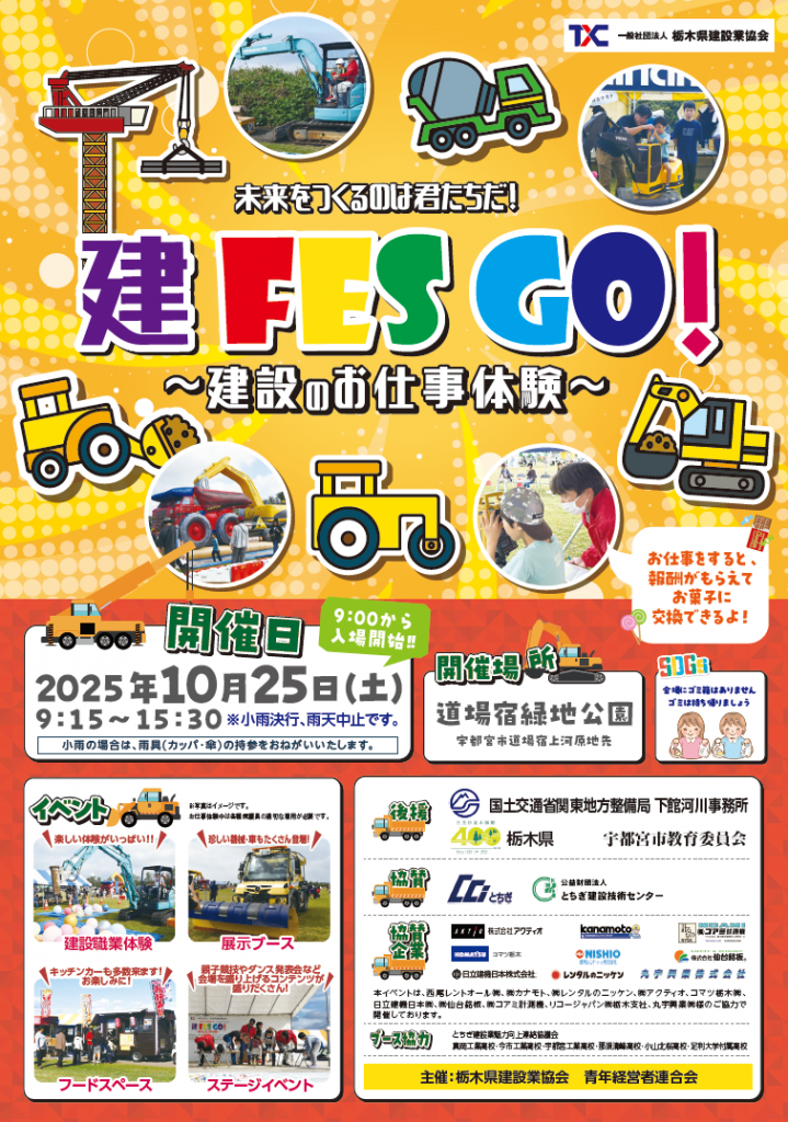 当日は、建設機械の展示や職業体験に加え、ステージイベントやキッチンカーなど、たくさんの楽しい企画をご用意してみなさまをお待ちいたしておりますので、是非お誘いあわせの上ご来場いただければ幸いです。