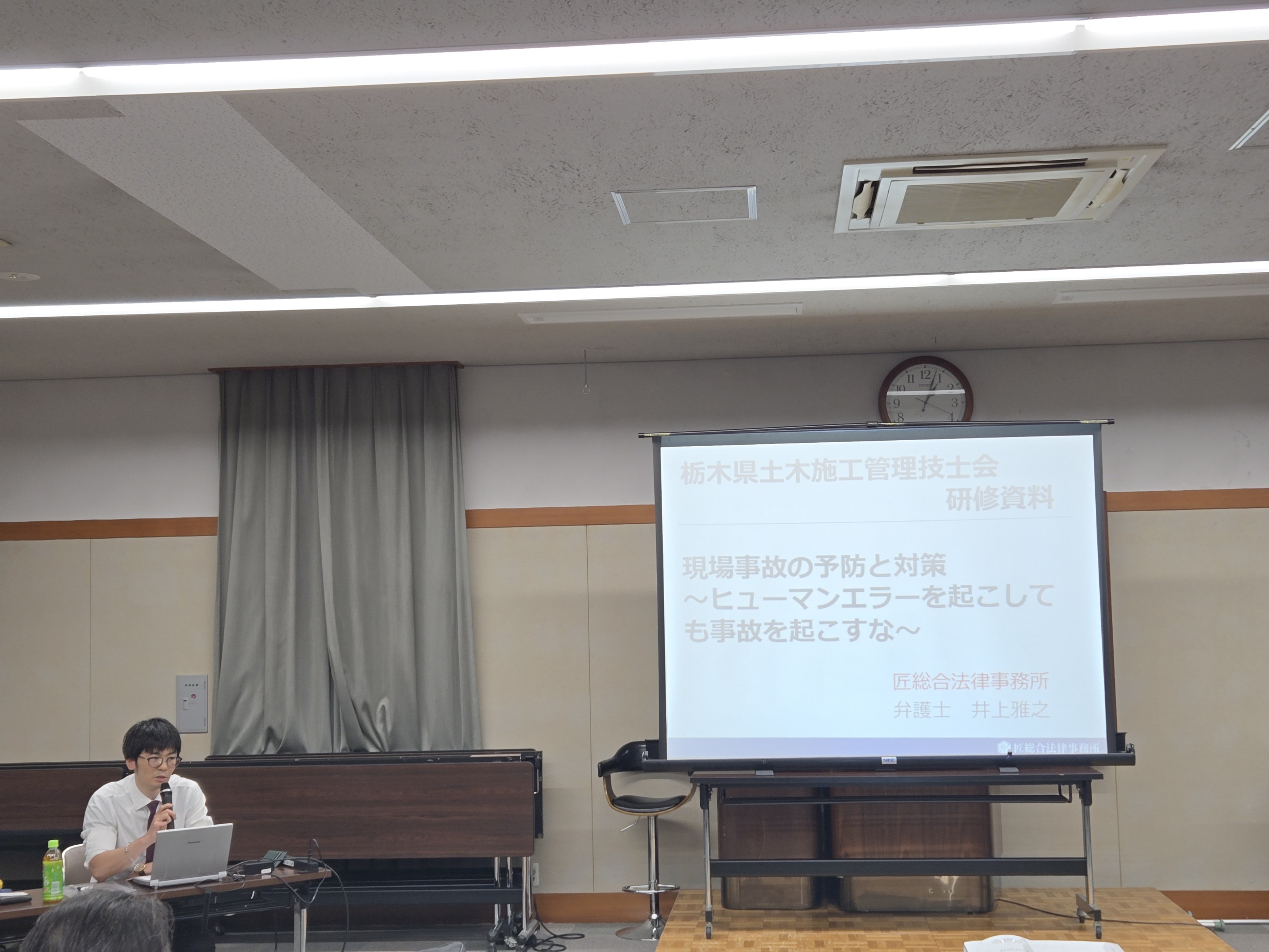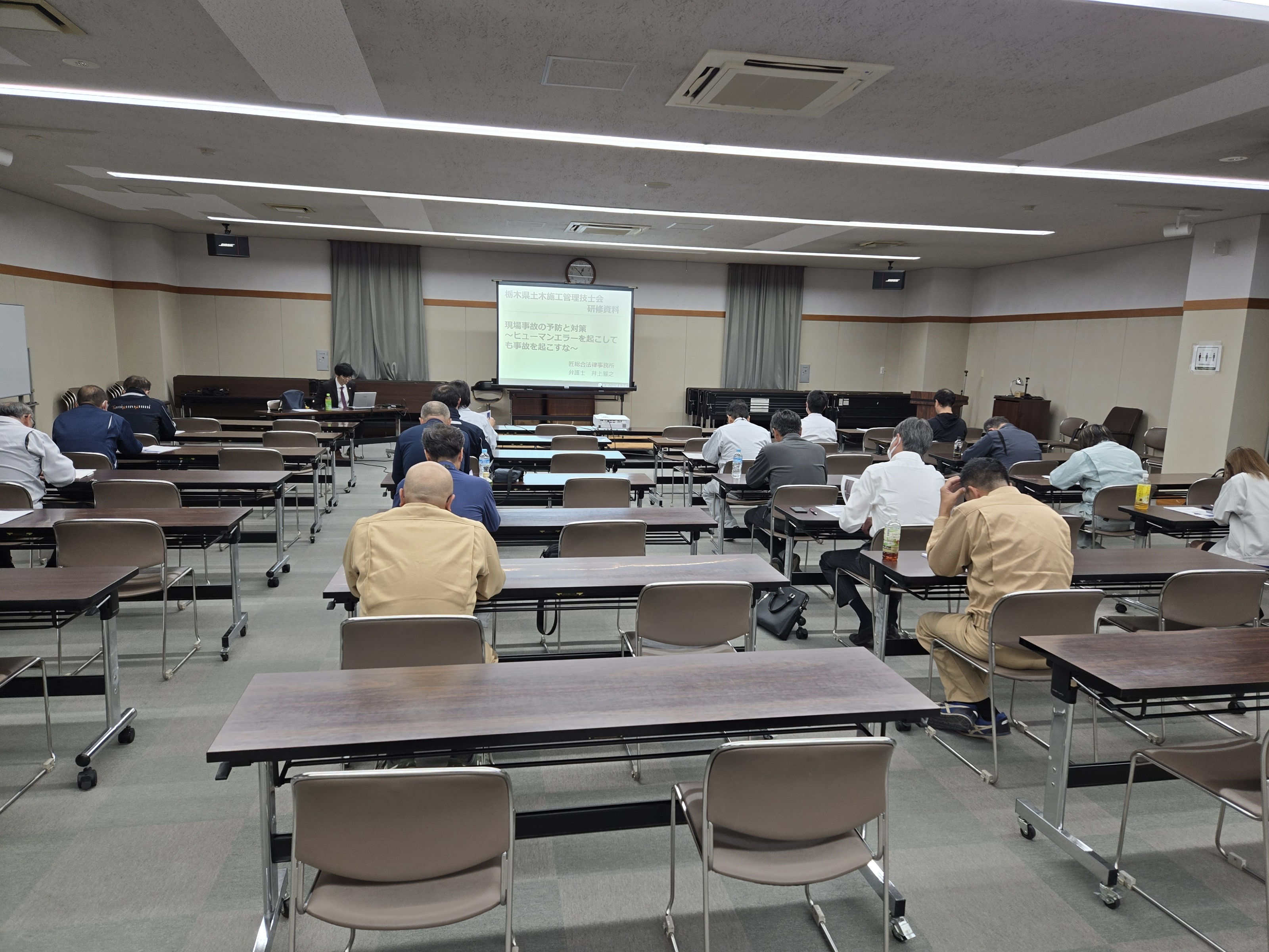 令和7年10月24日、栃木県建設産業会館にて「現場で守る労働災害防止とリスクマネジメント」を開催し、ヒューマンエラーを起こさないための仕組みづくりや心構えを習得することを目的に実施しました。「工事現場で発生した労働災害の事例紹介」、「事故の原因分析と予防ポイント」、「ヒューマンエラーを発生させないためのリスクマネジメントの重要性」、「労働災害発生時の法的責任」などを学び、事故発生防止の徹底に向けたカリキュラムでした。