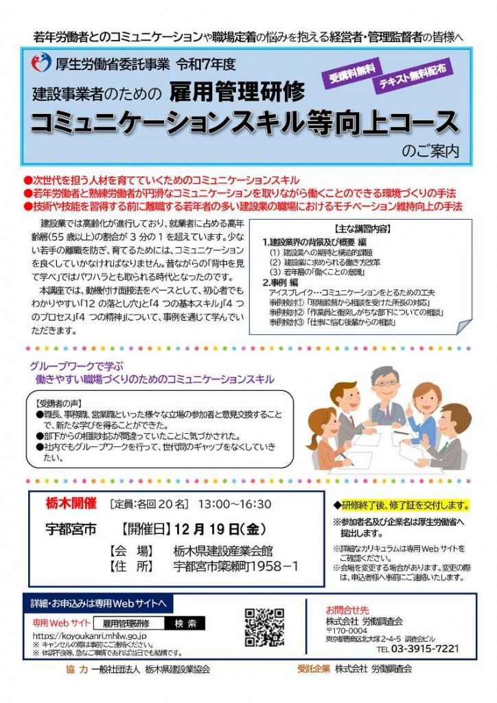 若年労働者とのコミュニケーションや職場定着の悩みを抱える経営者・管理監督者の皆様向け「雇用管理研修(コミュニケーションスキル等向上コース)」を栃木県建設産業会館において、下記のとおり開催いたします。