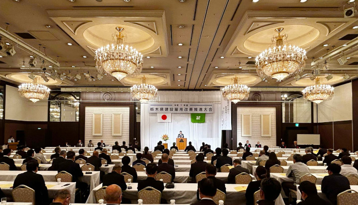 令和7年11月28日 ホテル東日本宇都宮において、栃木県建設雇用改善推進委員会および一般社団法人栃木県建設業協会が主催し、栃木労働局、栃木県、独立行政法人勤労者退職金共済機構 栃木県支部、栃木県建設産業団体連合会の共催による「栃木県建設雇用改善推進大会」を開催いたしました。